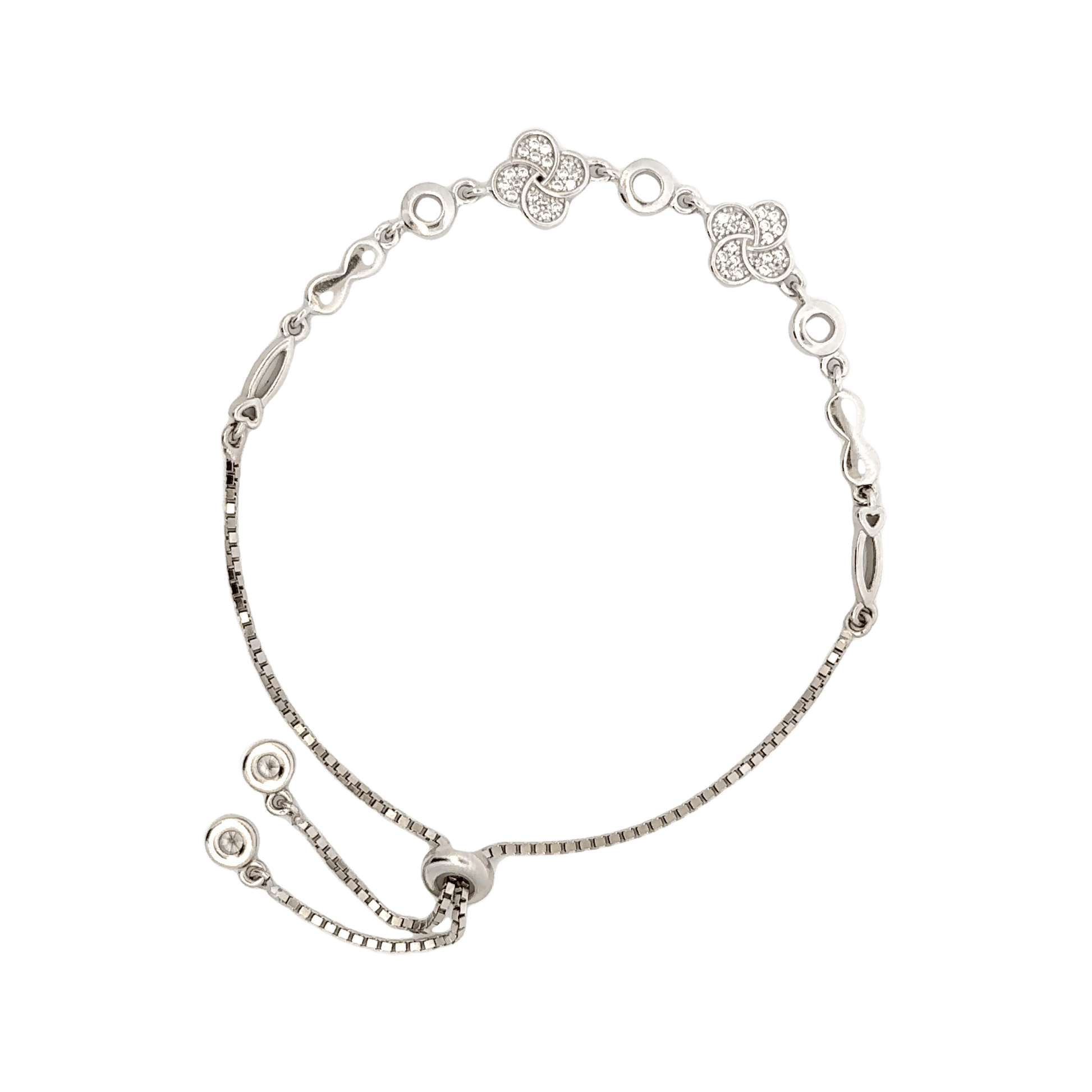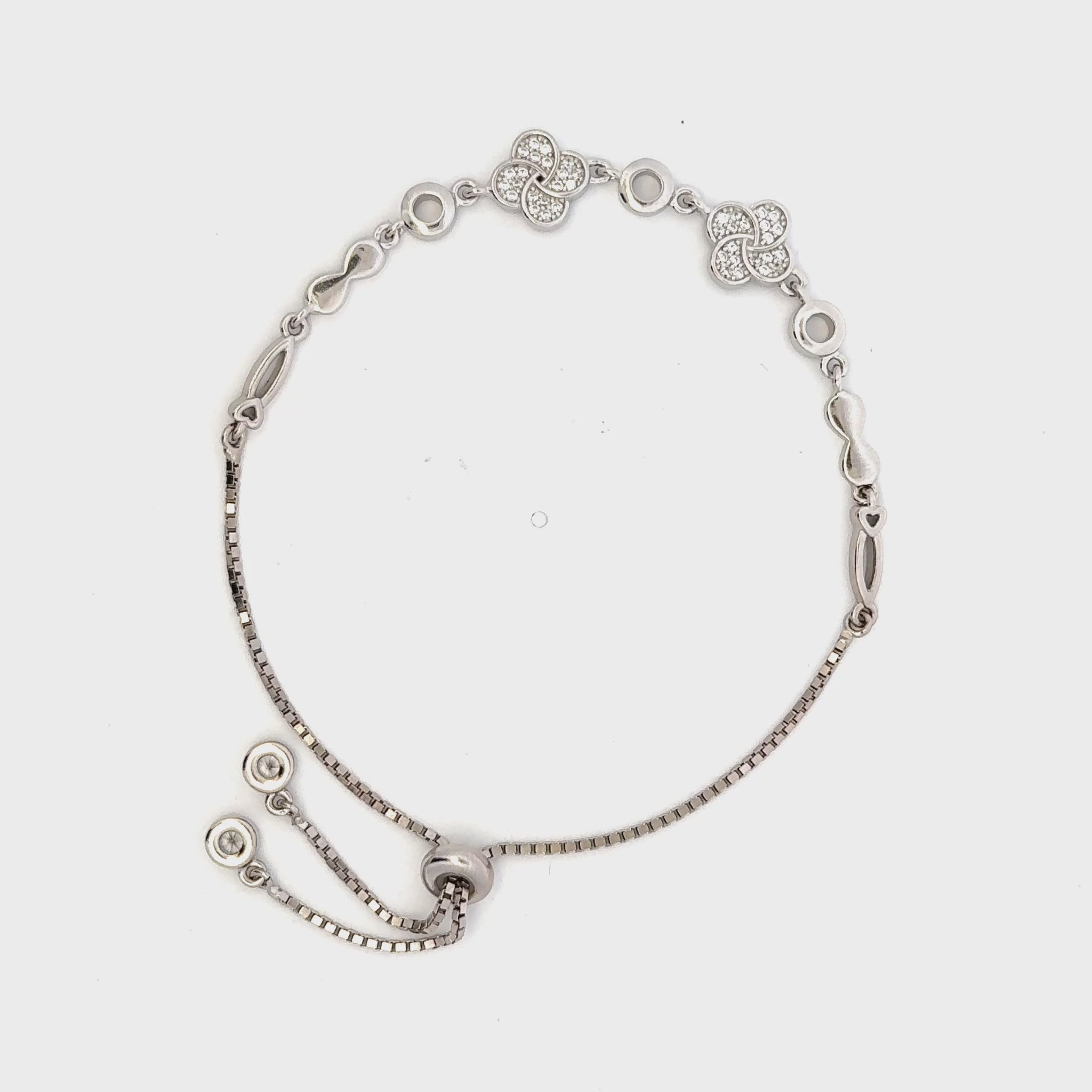 This rhodium-plated bracelet features elegant clover and infinity charms, symbolizing luck and eternity. Its polished finish ensures durability and a sophisticated shine, making it a timeless accessory suitable for both everyday wear and special occasions. Expertly crafted, it combines meaningful design with lasting quality.